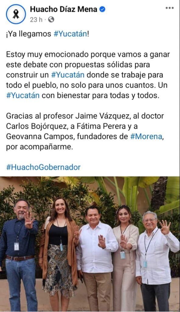 En ese negro panorama, ayer domingo Díaz Mena presumió en sus redes sociales una foto de su llegada al debate con “fundadores de Morena”: el ex director de la Facultad de Antropología Carlos Bojórquez Urzáiz, apreciado pensador de la izquierda, y el veterano profesor Jaime Vázquez Barceló, quien es uno de los fundadores del PSUM, del PRD y de Morena en la entidad: