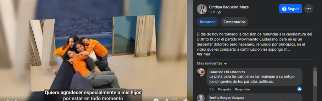 Cinthya Baqueiro Maza, candidata de Movimiento Ciudadano a diputada por el Distrito 09 local, renunció públicamente a ser candidata por el partido naranja y se sumó al proyecto conjunto de Renán Barrera Concha y Cecilia Patrón Laviada, candidatos a la gubernatura y la alcaldía de Mérida, respectivamente.