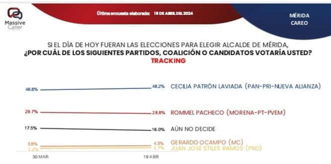 En el panorama político de Mérida, la candidata por el PAN-PRI y Nueva Alianza, Cecilia Patrón Laviada, se destaca como la clara favorita en la contienda por la alcaldía, según los resultados de la última encuesta que presenta por Massive Caller este viernes 19, que la coloca con una ventaja considerable de 20 puntos sobre su competidor más cercano, el ahora morenista Rommel Pacheco Marrufo. Cecilia Patrón evidencia una sólida preferencia por parte de los meridanos hacia su proyecto político.