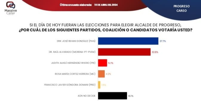 Por otro lado, en la carrera por la alcaldía de Progreso, el puerto más importante del Estado, Erik Rihani González se posiciona como el favorito, con el 37.5% de intención de voto. Esta ventaja de 5 puntos sobre su competidor más cercano, Raúl Alvarado, evidencia el respaldo que ha generado su propuesta entre los habitantes de Progreso.