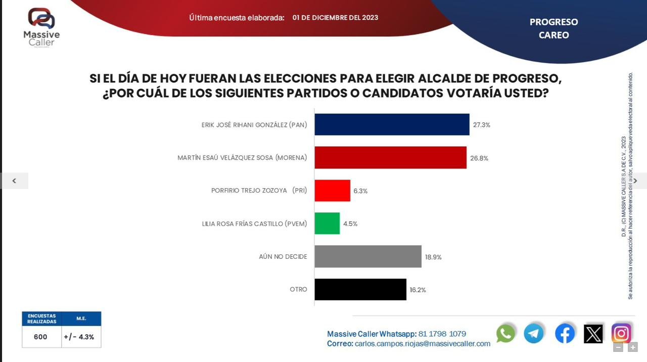 La encuesta muestra a Erik José Rihani González del PAN liderando con un 27.3% de apoyo ciudadano, seguido muy de cerca por Martín Esaú Velazquez Sosa de Morena, quien cuenta con un 26.8%. Estos resultados revelan un crecimiento notable para el candidato del PAN, marcando una tendencia clara antes del inicio oficial de las campañas.