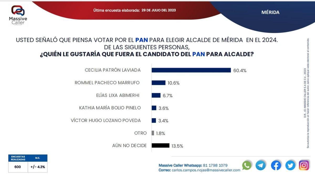 En contraste, los otros candidatos enfrentan un desafío significativo para ganar apoyo popular. Rommel Pacheco, con un 10% de aprobación, se encuentra en segunda posición, lo que podría indicar una competencia más reñida por la segunda plaza en las elecciones. Elías Lixa, con un 6.7%, se ubica en tercer lugar, seguido de cerca por Kathia Bolio y Víctor Higo, quienes obtienen un 3.6% y un 3.4%, respectivamente. Estos números resaltan la brecha significativa que separa a Cecilia Patrón del resto de los candidatos.