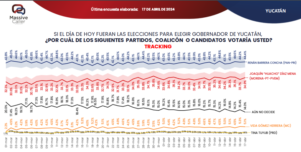 Campos Riojas enfatizó que la encuesta se actualiza diariamente, siendo un seguimiento continuo del panorama electoral. Además, resaltó la trayectoria de precisión de Massive Caller en elecciones anteriores, incluyendo aciertos en pronósticos para gobernador en 2018 y 2021, así como la reelección de Renán Barrera Concha como alcalde de Mérida en el mismo año.