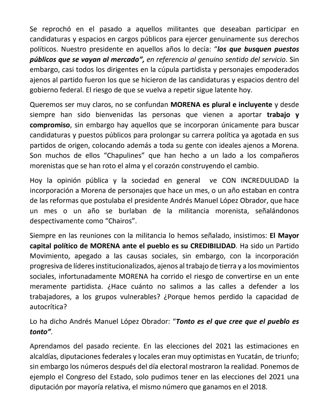 La declaración concluyó con la cita de Andrés Manuel López Obrador: “Es mejor la opinión de muchos que la decisión de unos cuantos”, enfatizando así la importancia de recoger los sentimientos de la base del partido en la toma de decisiones.
