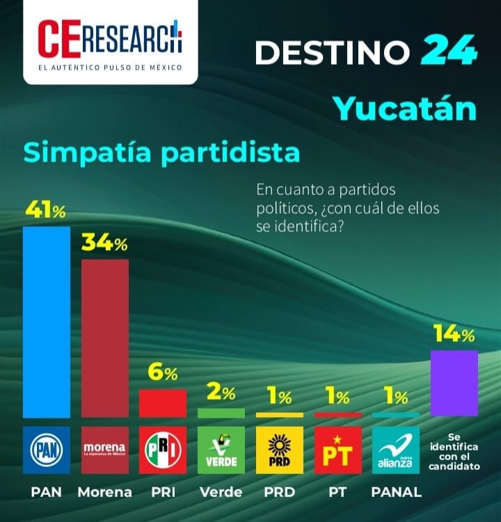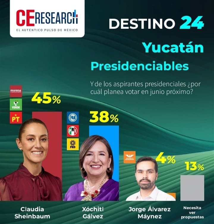 En el caso de las elecciones presidenciales en Yucatán, la encuesta arrojó que el 45% de sus entrevistados se inclinó por la morenista Claudia Sheinbaum Pardo, el 38% por Xóchitl Gálvez Ruiz, y el 4% por Jorge Álvarez Máynez; un 13 por ciento de los entrevistados respondió que antes de decidir su voto, necesitan escuchar propuestas: