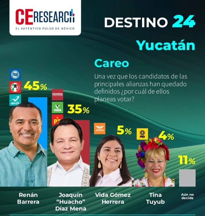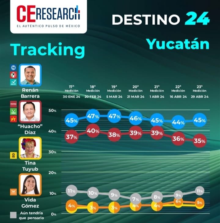 A casi un mes de los comicios, en la carrera por la gubernatura de Yucatán la reconocida firma encuestadora CE Research dio a conocer su más reciente radiografía, la cual confirma que la candidatura de Renán Barrera Concha mantiene una distancia de al menos diez puntos sobre su más cercano competidor.