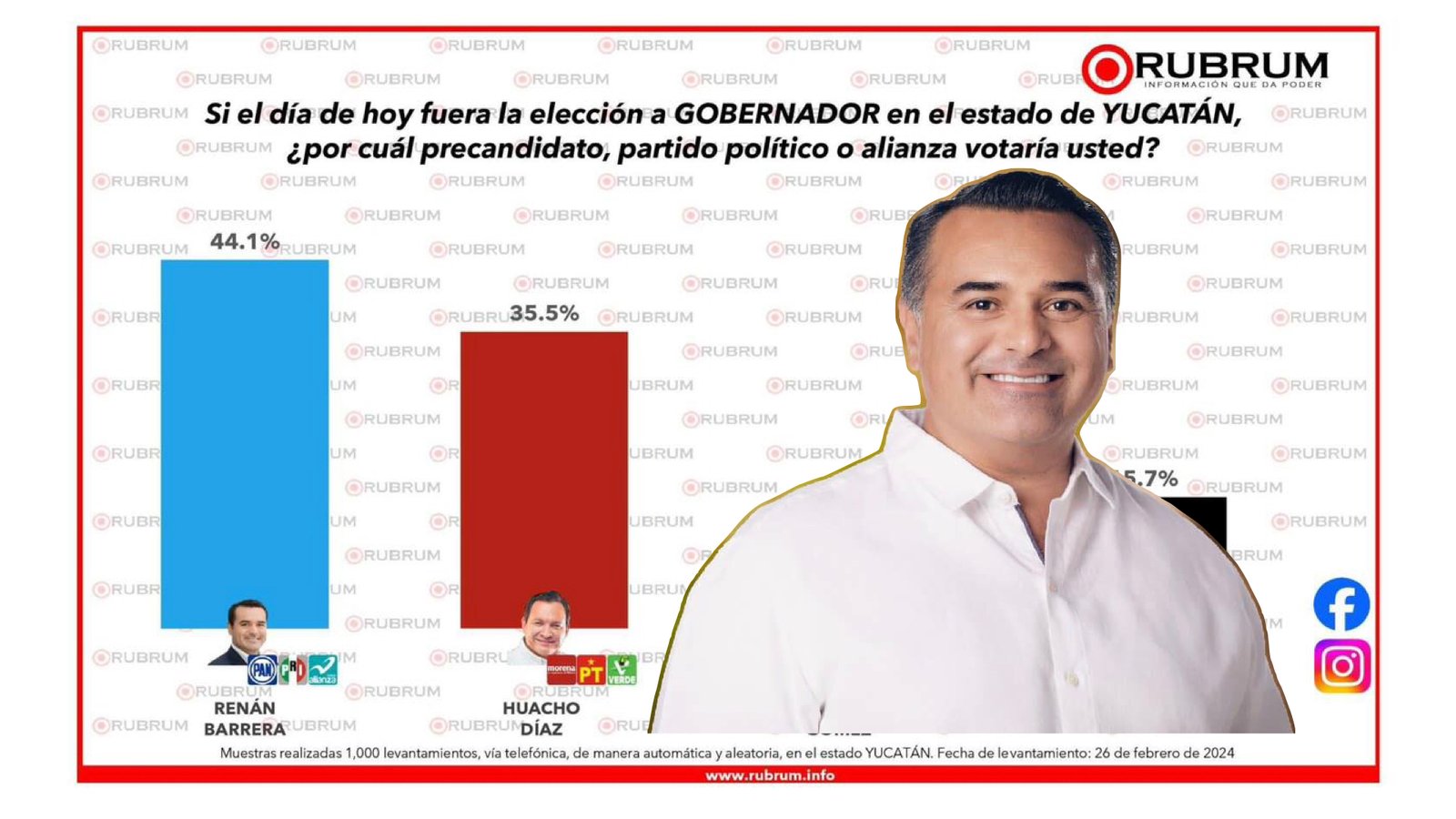 Según la última encuesta realizada por la Encuestadora Rubrum, Renán Barrera Concha, candidato de la coalición PAN-PRI-Nueva Alianza, lidera la preferencia electoral rumbo a la gubernatura de Yucatán, a tan solo tres días de que inicie la campaña el próximo 1 de marzo.