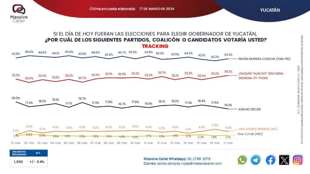 El más reciente informe de Massive Caller, difundido este lunes 18, revela que Renán Barrera Concha, candidato común de los partidos PAN, PRI y Panal, continúa liderando las preferencias para gobernador de Yucatán. Según la encuesta realizada el sábado 16, Barrera Concha mantiene una ventaja sólida de 9.1 puntos sobre su rival más cercano, Joaquín “Huacho” Díaz Mena, del Morena-PT-PVEM.